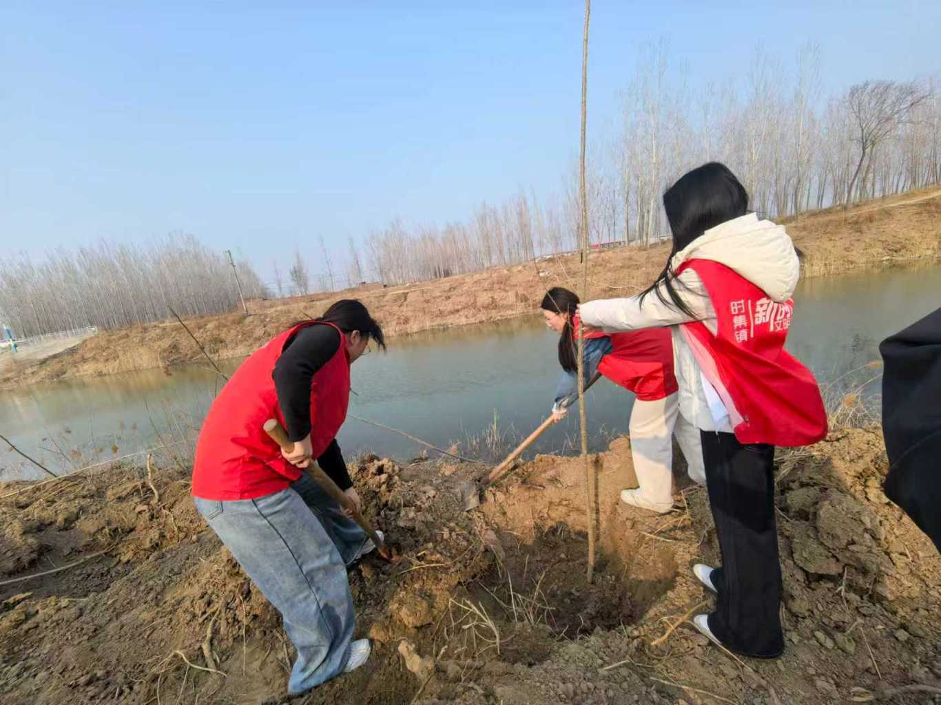 3月12日植树节当天,时集镇新时代文明实践所组织志愿者,在虎西村坑塘两侧开展“履行植树义务 共建美丽家园”义务植树活动,以实际行动为美丽时集增添新绿。活动现场,大家热情高涨、干劲十足。三五人自由分组,分工协作,每个环节都一丝不苟。经过一下午的辛勤劳作,百余棵杨树在春风中昂然挺立。活动间隙,志愿者们还向过往群众发放环保知识宣传页,普及植树造林、垃圾分类等生态文明理念,引导大家从身边小事做起,共同守护绿色家园